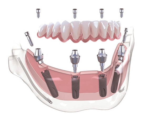Arco completo Isso significa que vamos substituir todos os dentes em um arco completo, superior ou inferior, com prótese fixa ou removível suportada por implantes. Trata-se de uma reabilitação completa do sorriso e da função mastigatória.